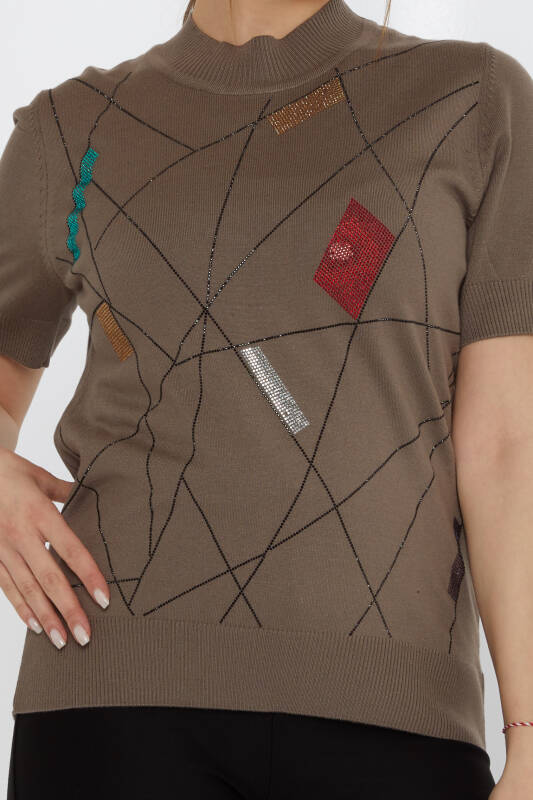 Knitted Sweater Colored Stone Embroidered Short Sleeve Mink - 30078 | KAZEE (Set of 4 L-XL-2XL-3XL)