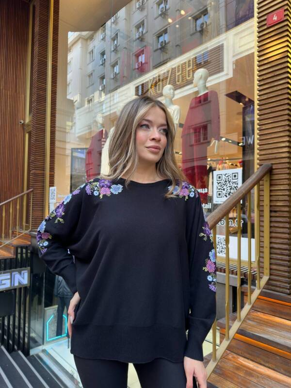 Colorful Embroidered Long-Sleeve Knitted Sweater Black - 32253 | KAZEE (3-Piece Set L-XL-2XL)