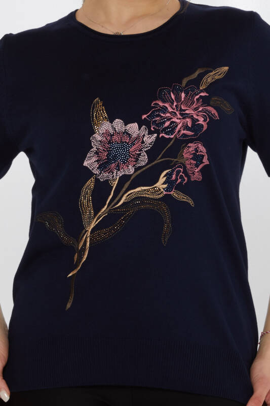 Knitted Sweater Floral Embroidered Stone Embroidered Navy Blue - 31725 | KAZEE (Set of 3 L-XL-2XL)