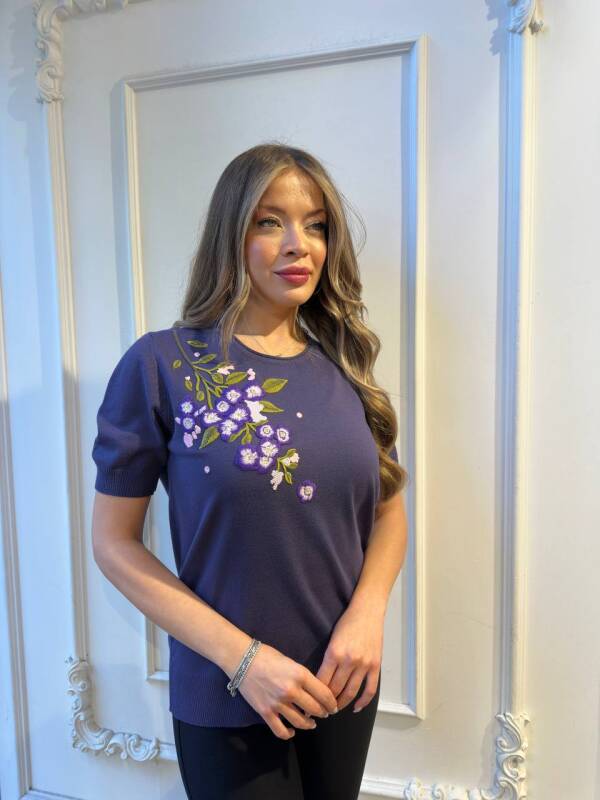Knitted Sweater with Floral Embroidery and Stone Embellishments, Navy Blue - 32040 | KAZEE (3-Piece Set M-L-XL)