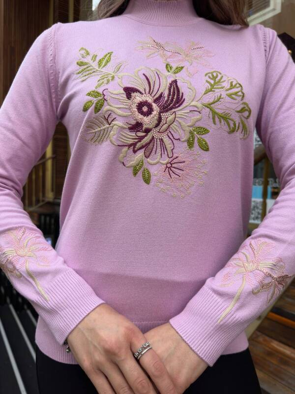 Pink Knitted Sweater with Floral Embroidery and Stone Embellishments - 32088 | KAZEE (3-Piece Set M-L-XL)