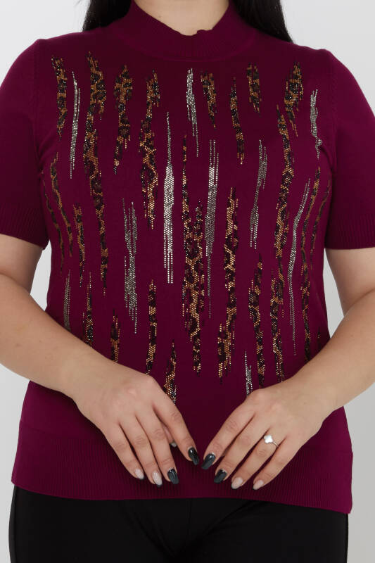 Knitted Sweater Leopard Stone Embroidered Stand Collar Purple - 31565 | KAZEE (Set of 3 M-L-XL)