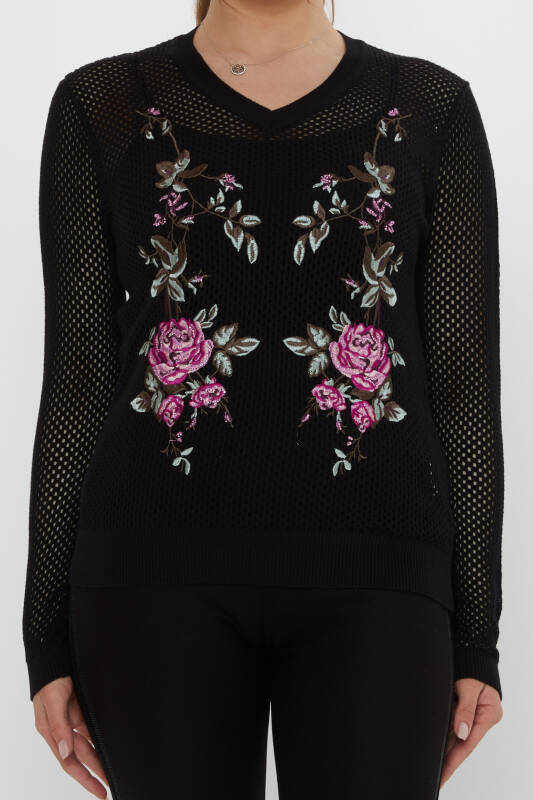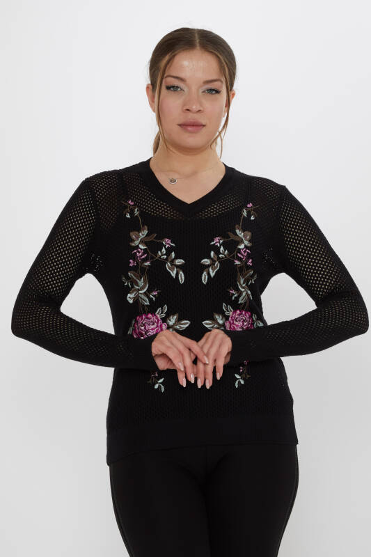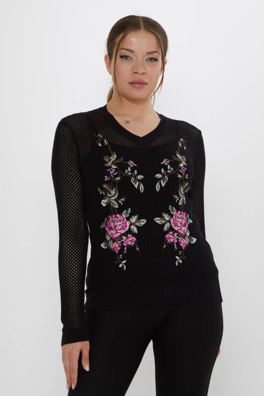 Knitted Sweater with Rose Embroidery and Hole Detail, Black - 31113 | KAZEE (3-Piece Set S-M-L)