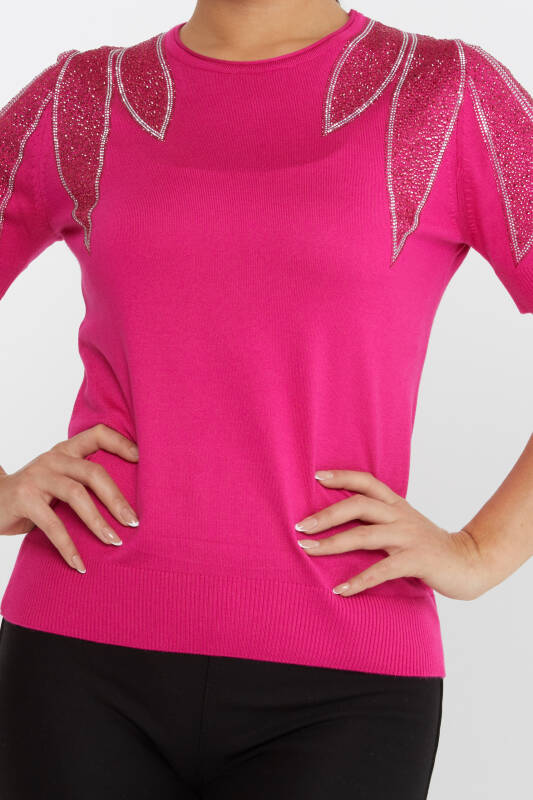 Knitted Sweater Shoulder Stone Embroidered American Model Fuchsia - 30792 | KAZEE (Set of 4 M-L-XL-2XL)