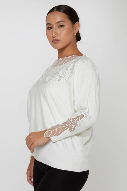 Knitted Sweater Stone Embroidered Tulle Detail Ecru - 31227 | KAZEE (Set of 3 L-XL-2XL)