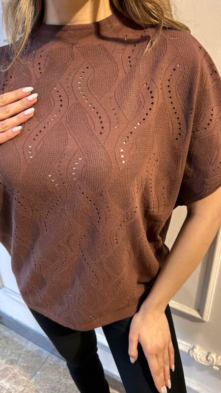 Short-Sleeved Knitted Sweater with Stone Embellishments, Brown - 31920 | KAZEE (3-Piece Set L-XL-2XL)