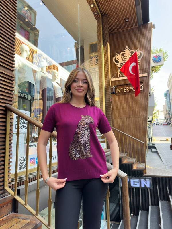 Knitted Sweater Tiger Patterned Stone Embellished Fuchsia - 32208 | KAZEE (3-Piece Set L-XL-2XL)