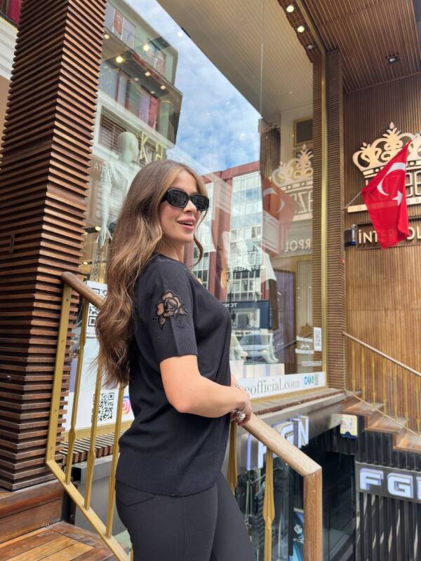 Black Knitted Sweater with Stone Embellished Tulle Details - 32209 | KAZEE (3-Piece Set L-XL-2XL)