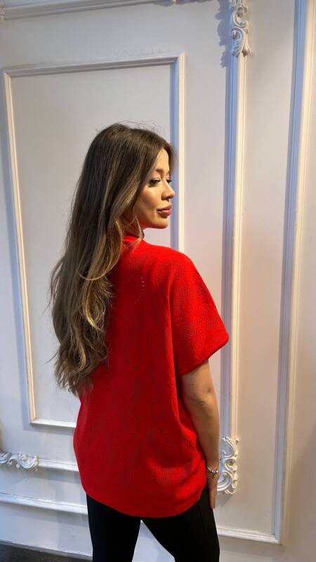 Red Short-Sleeved Knit Sweater with Stone Embellishments - 31920 | KAZEE (3-Piece Set L-XL-2XL)
