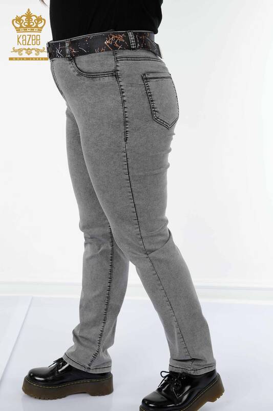 بنطلون جينز نسائي - بنمط نمر ، مزين بحزام ، رمادي - 3465 | كازي