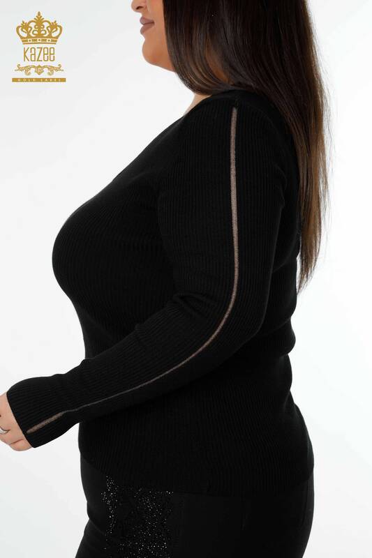 جاكيت تريكو نسائي بياقة على شكل V منسوج ذاتيًا أسود - 16249 | كازي