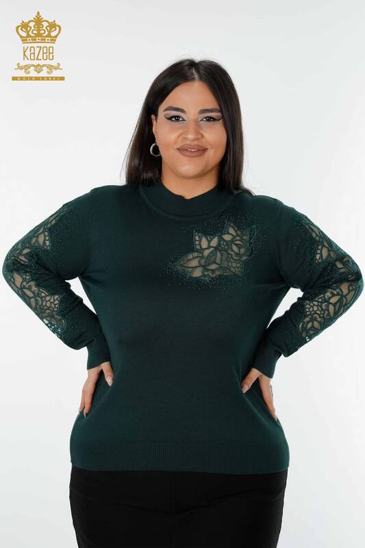 كنزة تريكو نسائية بالجملة من التول مُفصل بأحجار مُطرزة بنمط وردة أخضر داكن - 16832 | كازي