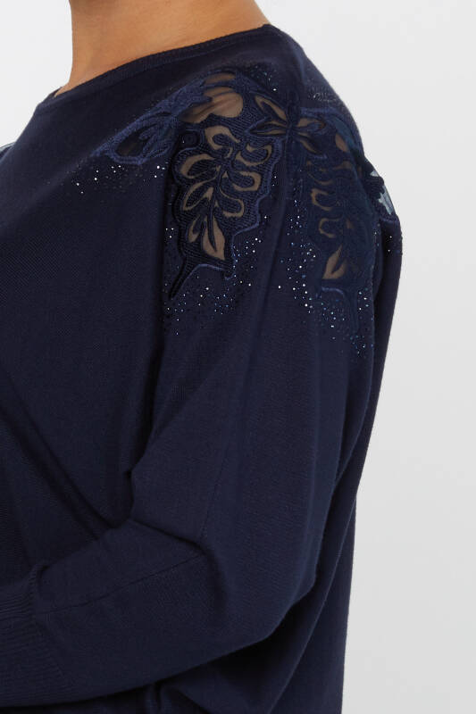 Maglieria Maglione Spalla Tulle Ricamo Dettagliato Pietra Ricamata Blu Navy - 30903 | KAZEE (Set da 4 L-XL-2XL-3XL)