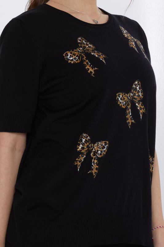 Maglione in maglia con fiocco in pietra ricamato a manica corta nero - 31577 | KAZEE (Set di 3 XL-2XL-3XL)