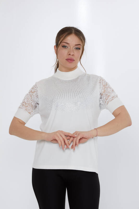 Maglione in Maglia con Maniche in Pizzo Pietra Ricamato Ecru - 30959 | KAZEE (Set di 4 M-L-XL-2XL)