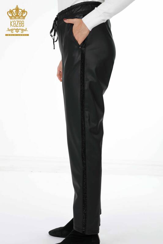 Venta al por mayor Pantalones de cuero para mujer Cordón bordado con piedra de cristal plateado - 3645 | kazee
