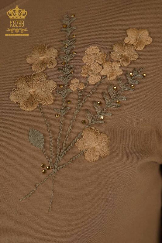 Venta al por mayor Blusa de Mujer Bordado Floral Piedra Bordada Escote en V Marrón Claro - 79466 | KAZEE