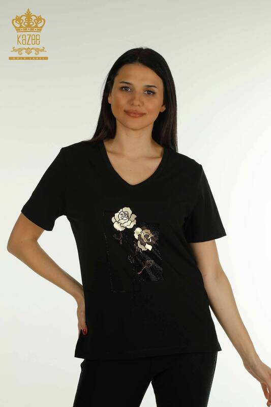Venta al por mayor Blusa de Mujer Flor Bordada Piedra Bordada Manga Corta Negro - 79860 | KAZEE