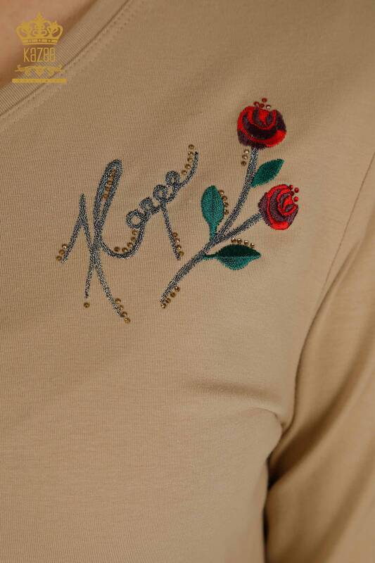 Venta al por mayor Blusa de mujer Rosa bordada Manga corta Piedra bordada Beige - 79867 | KAZEE