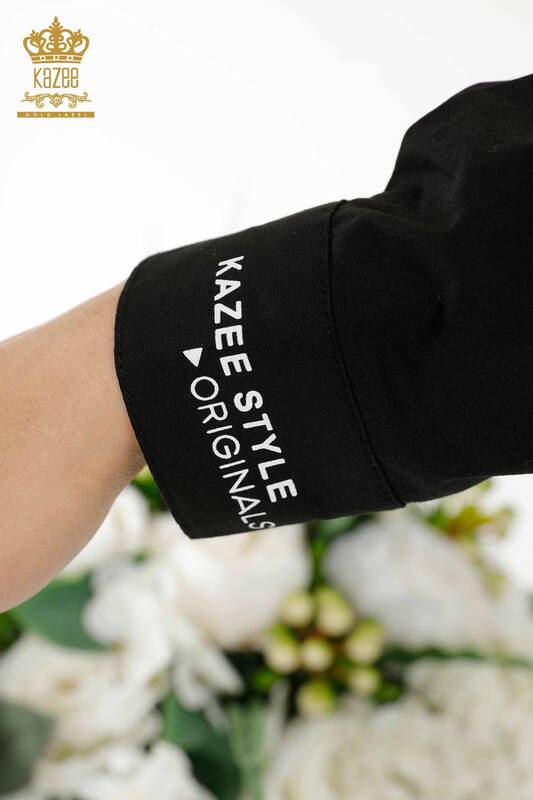 Venta al por mayor Botón de la camisa de las mujeres Carta detallada detallada Negro - 20328 | kazee