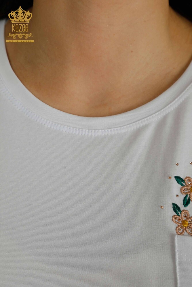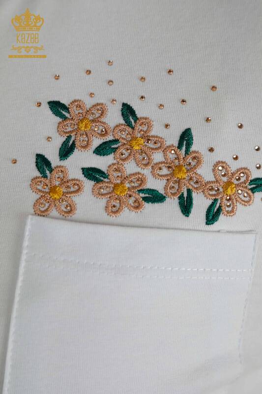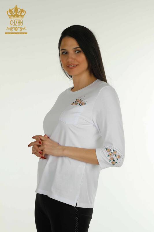 Venta al por mayor Blusa de mujer con bolsillo y estampado floral detallado con bordado de piedra blanco - 79477 | KAZEE