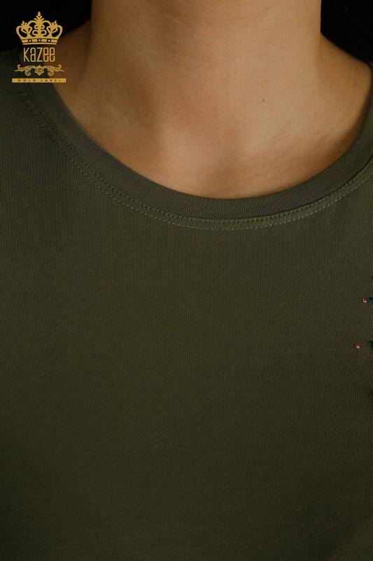 Venta al por mayor Blusa de mujer con bolsillo detallado con estampado de flores y piedra bordada de color caqui - 79477 | KAZEE