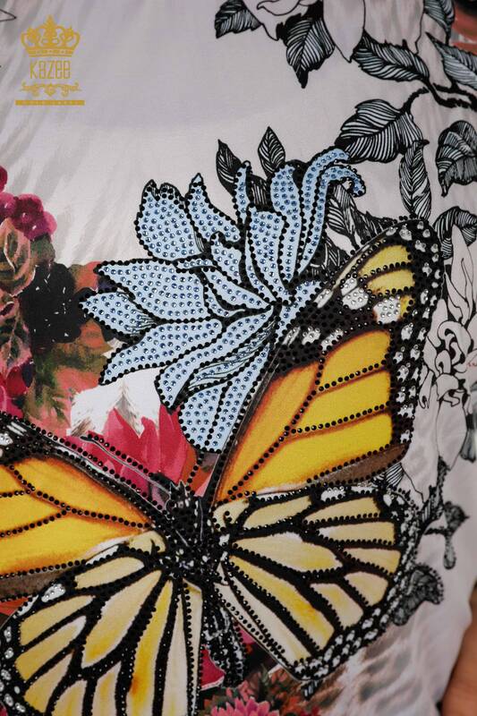 Venta al por mayor Blusa de Mujer con Estampado de Mariposas Manga Corta Bordada con Piedras Azul Marino - 12026 | kazee