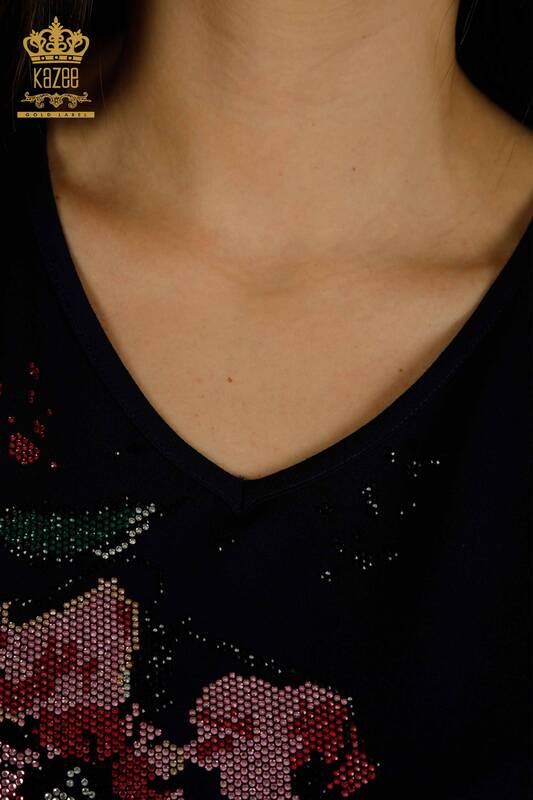 Venta al por mayor Blusa de Mujer Estampado Floral Piedra Tul Bordado Detallado Azul Marino - 79107 | kazee