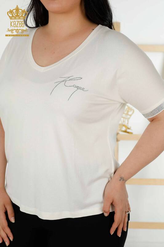 Venta al por mayor Blusa de mujer con detalle de botones bordados en piedra manga corta color crudo - 79297 | kazee