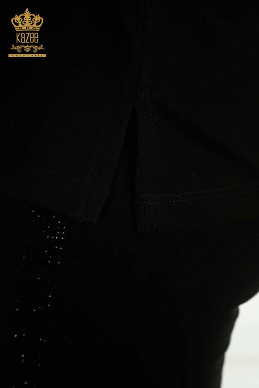 Venta al por mayor Blusa de mujer con cuello en V y logo bordado en piedra Negro - 79564 | KAZEE