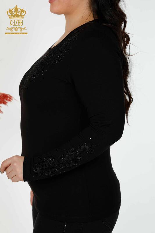 Venta al por mayor Blusa de mujer con diseño floral bordado en piedra de cristal negro - 79010 | kazee