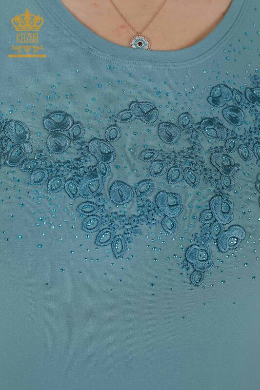 Venta al por mayor Blusa de Mujer con Bordado de Piedra de Cristal Estampado Floral Azul - 79010 | kazee