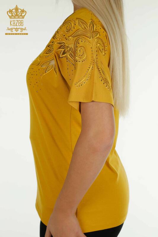 Venta al por mayor Blusa de Mujer Estampado Floral Manga Corta Bordado Piedra Azafrán - 79093 | kazee