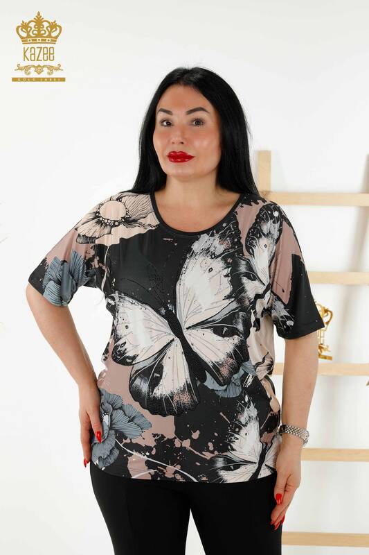 Venta al por mayor Blusa de mujer con estampado de mariposas y piedras bordadas en negro - 77900 | kazee