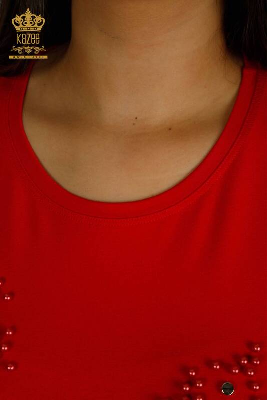 Venta al por mayor Blusa de mujer con cuentas bordadas cuello redondo rojo - 79201 | kazee