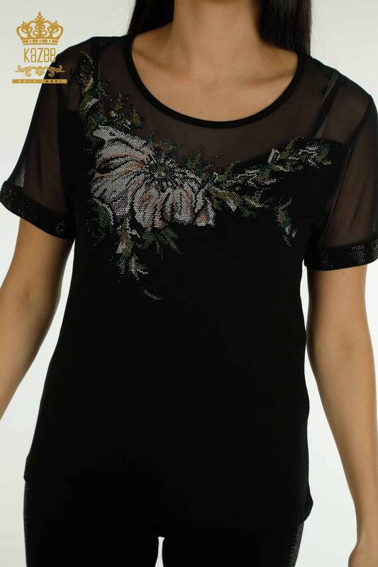 Venta al por mayor Blusa de Mujer Color Piedra Bordado Manga Corta Patrón Floral Tul Detallado Negro - 79106 | kazee