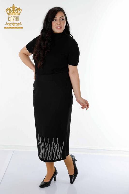 Venta al por mayor Falda de mujer con bolsillo largo de piedra de cristal con abertura bordada detallada en negro - 4190 | kazee