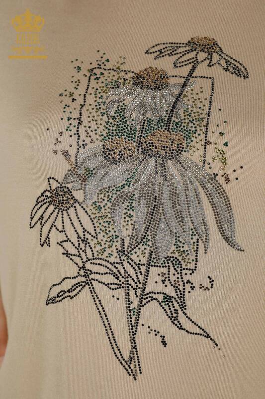 Venta al por mayor Suéter de punto de mujer con estampado floral de manga corta con bordado de piedra beige - 16963 | kazee