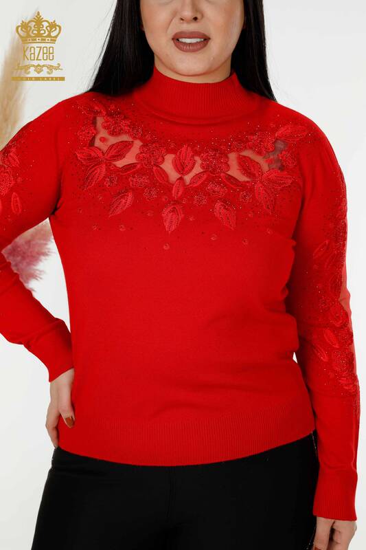 Venta al por mayor de prendas de punto para mujer con mangas de tul y detalles de piedra bordada en rojo - 30123 | kazee