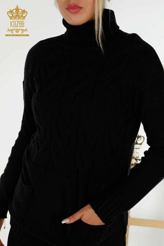 Venta al por mayor de Prendas de Punto para Mujer Suéter Cuello Alto Dos Bolsillos Tejido Negro - 30231 | KAZEE