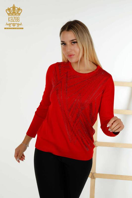 Venta al por mayor de punto de mujer suéter cuello redondo piedra bordado rojo - 30027 | KAZEE