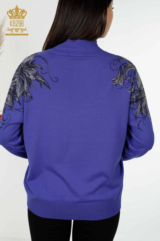 Venta al por mayor de prendas de punto para mujer, suéter, hombro, flor, detalle de piedra, bordado violeta - 16597 | kazee