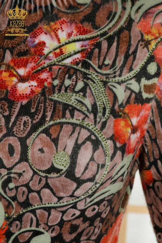 Venta al por mayor Suéter de punto para mujer con estampado digital de piedra bordada con estampado caqui - 18971 | kazee