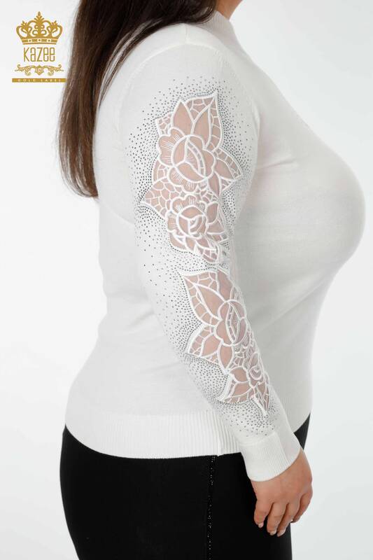 Venta al por mayor Suéter de punto para mujer de tul con detalle de piedra bordada con estampado de rosas color crudo - 16832 | kazee
