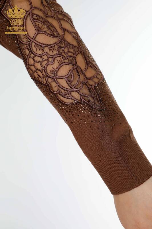 Venta al por mayor Suéter de punto de mujer de tul con detalle de piedra bordada con estampado de rosa marrón - 16832 | kazee