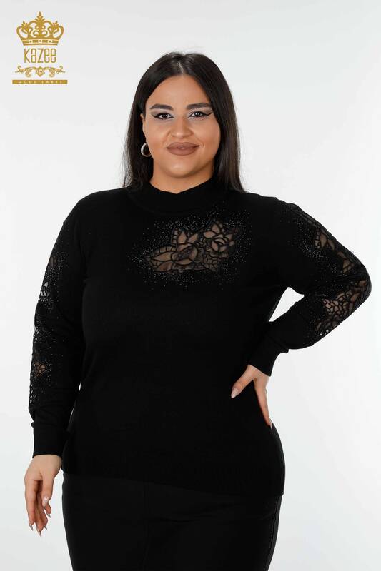 Venta al por mayor de las mujeres suéter de punto de tul detallada piedra bordado Rose patrón negro - 16832 | kazee