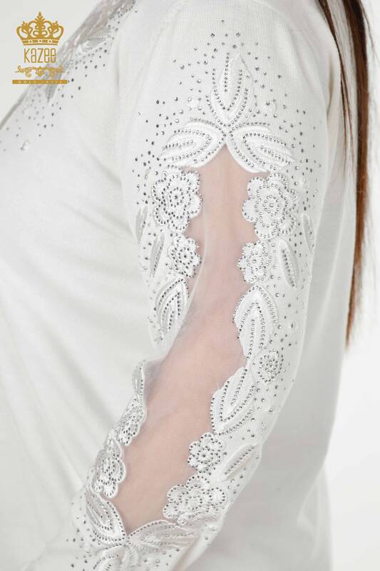 Venta al por mayor de prendas de punto para mujer, suéter, manga, tul, piedra detallada, bordado, color crudo - 30123 | kazee
