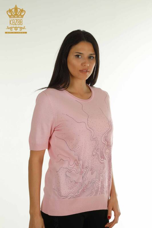 Venta al por mayor Suéter de Punto para Mujer Modelo Americano Bordado con Piedra Manga Corta Rosa - 30659 | KAZEE