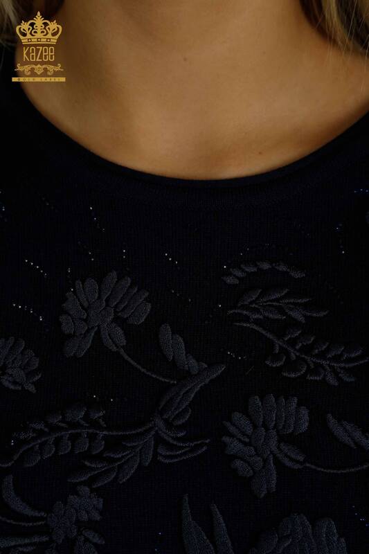 Venta al por mayor Prendas de punto para mujer con estampado floral, bordado de piedra, manga larga, azul marino - 16849 | KAZEE