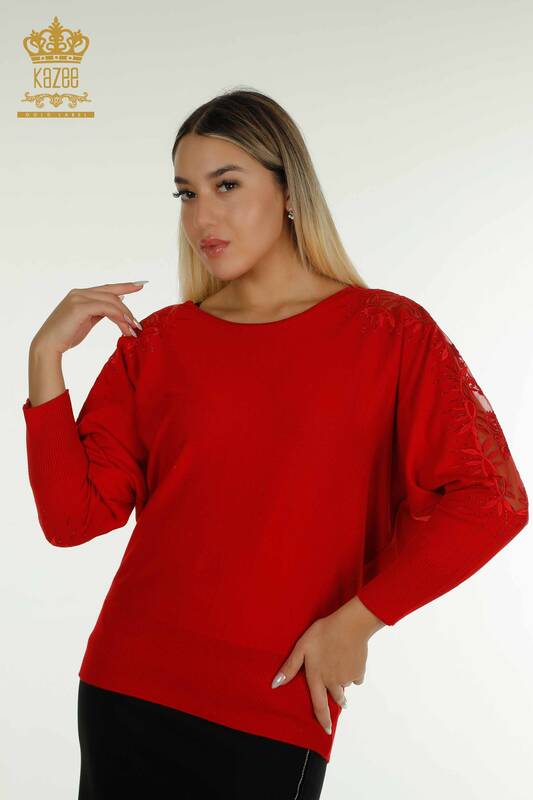 Venta al por mayor Suéter de Punto para Mujer Tul Detallado Piedra Bordada Rojo - 15699 | KAZEE